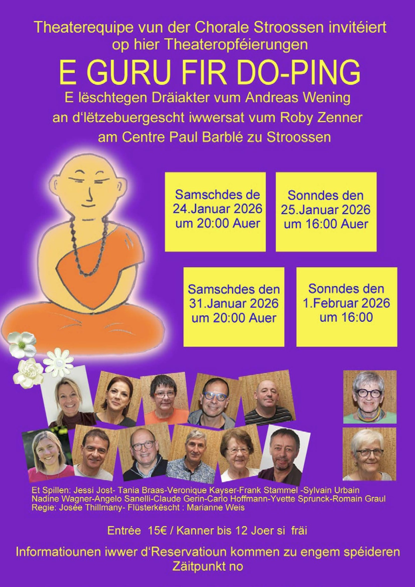 Theaterequipe vun der Chorale Stroossen invitéiert op hier Theateropféierung "E Guru fir Do-Ping".