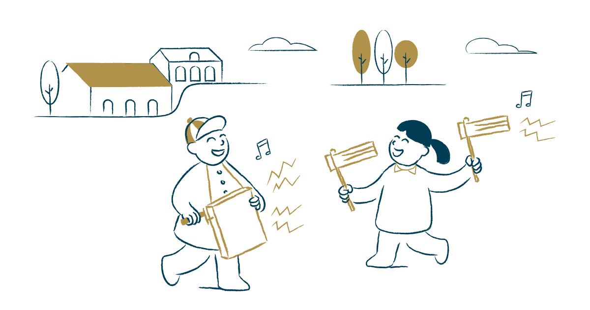 Les enfants accompagnent le bruit des crécelles en criant à plains poumons : "D'Klack laut d'éischt, d'Klack laut d'zweet an d'Klack laut of".